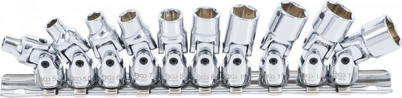 Fémsínen S zállítási Terjedelem: Csuklós Dugókulcsbetétek 5 - 5,5 - 6 - 7 - 8 - 9 - 10 - 11 - 12 - 13 Bruttó Súly: 302 G Anyag: Króm-Vanádium Acél Felületjavítás: Krómozott, Magasfényű Falikárpithoz Alkalmas Csomagolás: Igen