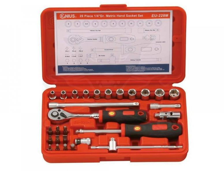 GENIUS TOOLS Dugókulcs készlet 1/4" 6 lap 28 részes Genius (EU-228M) Genius Tools - Canada Crowafej és bit készlet, metrikus 1/4", 28 darabos Anyag:Króm-vanádium acél. A szerszámacélok legfontosabb tulajdonságai a keménység és a kopásállóság. A vanádium tovább növeli a keménységet és a kifáradással szembeni ellenállást. A króm az acélt rozsdamentessé, savállóvá te