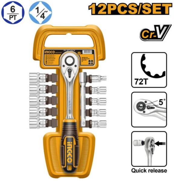 Méretek: 5 mm, 6 mm, 7 mm, 8 mm, 9 mm, 10 mm, 11 mm, , 12 mm, 13 mm, 14 mmAnyaga: 50BV30 magas minőségű CrV acélRacsnis hajtószár 72T, 3 színű puha markolatToldószár 100 mmHőkezeltKrómozott Szállítási terjedelem: 10 db 1/4" dugókulcs, 1 db 1/4" racsnis hajtószár, 1 db 1/4" toldószár, Műanyag akasztó