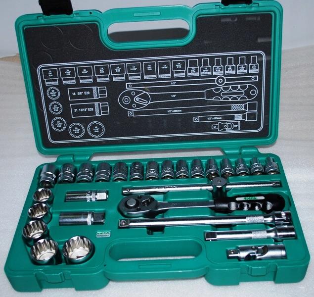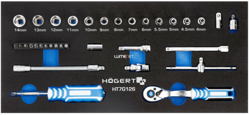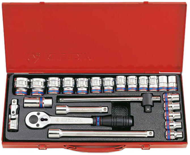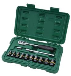 Króm-vanádium acélból készül; Műanyag kofferben; "Super Lock" profil. A készlet tartalma: 1/4" hajtású szerszámok, kiegészítők 1 db kétirányú racsnis hajtószár, 90 fogas kilincsmű 1 db csúszó hajtószár 2 db hosszabbító szár: 50 - 100 mm 1 db csukló adapter 1 db csavarhúzó markolat, 150 mm 13 db dugókulcs fej: 4 - 4.5 - 5 - 5.5 - 6 - 7 - 8 - 9 - 10 - 11 - 12 - 13 - 14