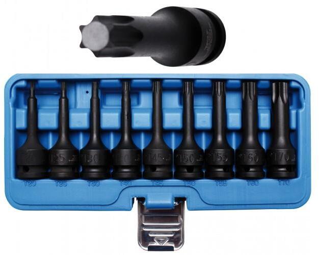 tartalma: T-torx méretek T20-25-30-40-45-50-55-60-70 (nem biztonsági) hossza 75 mm illesztő horonnyal lyukkal a visszatartó golyó számára különösen alkalmas levegőszerszámmal történő használathoz