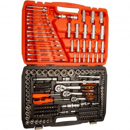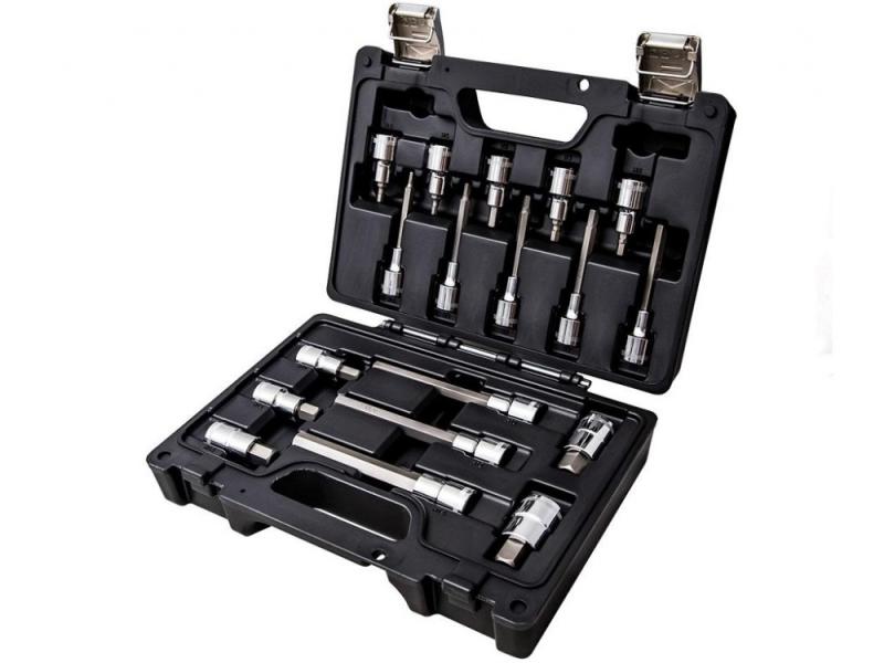 Ismertetés 1/2", 3/8" és 1/4" kulcsokkal Anyaga: Chrome-Vanadium Csúszásmentes racsnis hajtókar 1db Műanyag koffer Tartalma 1/2" készlet: 1db 1/2" racsnis kulcs, irányváltós 14db 6 lapos dugókulcs: 13, 14, 15, 16, 17, 18, 19, 20, 21, 22, 24, 27, 30, 32mm 5db 6 lapos hosszított dugókulcs: 16, 17, 18, 19, 22mm, 77L 2db Hosszabbító: 125, 250mm 1db Csúszó T szár 1db Csuklós adapter