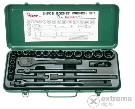 HANS 1/2" dugókulcs készlet 8-32mm 24 részes hatszög 4625M Cr-V fekete az iSzerszámnál. Professzionális, ipari minőségű HANS 1/2" dugókulcs készlet 8-32mm 24 részes hatszög 4625M Cr-V fekete. Anyagösszetétel: Chrome-Vanadium (Cr-V). A 24 részes készlet tartalma 1-1 db: dugókulcsfej: 8; 10; 11; 12; 13; 14; 15; 16; 17; 19; 20; 21; 22; 23; 24; 27; 30; 32mm 24 fogas irányváltós r