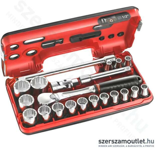 FACOM Dugókulcs készlet irányváltós racsnival, 12 pontos, 1/2, metrikus méretek - 21 db-os FACOM Karbantartásmentes irányváltós racsni, 1/2, 262 x 37 mm Rendkívül tartós - Porálló szerkezet Dupla tömítés Magas fokú precizitás - 72-fogas szerkezet 5°-os fogazású racsni Integrált irányváltó funkció – nem áll fenn a véletlen irányváltás lehetősége Az irányváltó