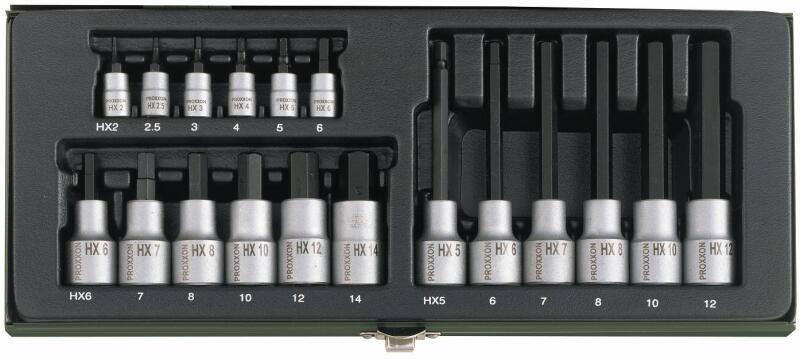 Speciális készlet imbuszcsavarokhoz. 18 részes. ¼- négylapfejű hajtáshoz és 10 Nm meghúzási nyomatékhoz. 2 – 6 mm méretekben. ½ – négylapfejű hajtáshoz és 25 – 210 Nm meghúzási nyomatékhoz. . 6 – 14 mm méretekben. ( rövid verzió 55 mm ) és 5 – 12 mm méretekben ( hosszú verzió 100 mm )