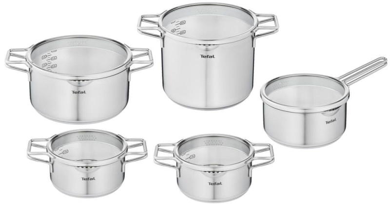 Vigyen a konyhájába minimalista szemléletet és ügyes formatervet a Tefal Nordica edénykészlettel. Ez a prémium minõségű rozsdamentes acél edénykészlet optimális hõelosztást biztosít, amely kiválóan alkalmas finom ételek elkészítésére, az egész család számára, esztétikus átgondolt dizájnnal ellátott: szabadalmaztatott kettõs fogantyúk, okos fedelek és integrált