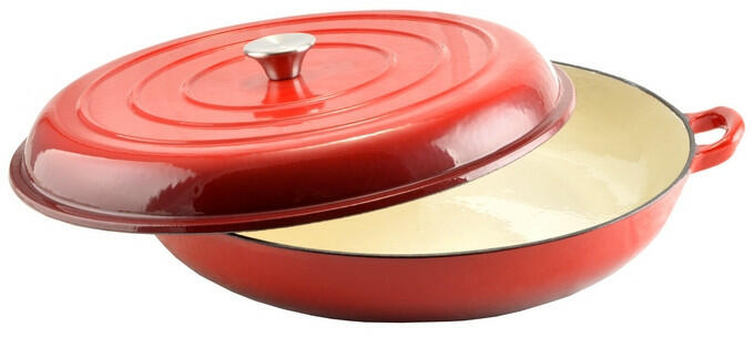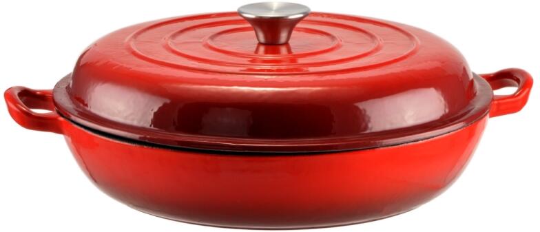 Ez a piros színű, zománcozott öntöttvas edény kiváló választás minden konyhába, ahol a minőség és a stílus egyaránt fontos!Az edény 30,5 cm-es külső átmérővel, 37,5 cm szélességgel a fülekkel együtt, valamint 6 cm magassággal fedő nélkül és 12,5 cm magassággal fedővel rendelkezik. A belső átmérője 29,5 cm, így bőséges helyet biztosít az ételek elkészíté