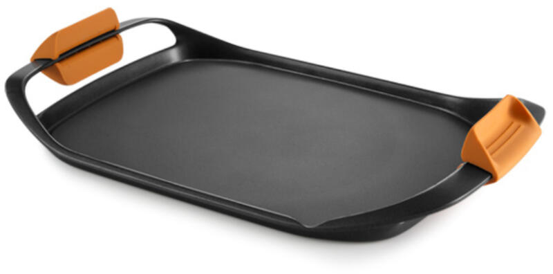 Tescoma SmartCLICK sima grill serpenyő 42 x 28 cm Tágas sima grill serpenyő hőálló szilikon fogantyúkkal és sima felülettel, kiváló halak, zöldség, hús grillezésére és tálalására. 2 hőzónával :a serpenyő közepe intenzív grillezéshez , az oldalsó helyek sütéshez és az ételek hőmérsékletének megtartásához. Elsőosztályú tapadásmentes bevonat az odaégés elle