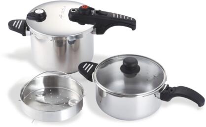 Inoxibar 18/10 rozsdamentes gyorsfőző/kukta szett 4 l, 6 l G-Sola. A szett tartalma: kukta 4 l, átmérő: 22 cm, 11.5 cm magas, kukta 6 l, átmérő: 22 cm, 17 cm magas, kukta fedő, üved fedő, főző kosár. Hőálló ergonomikus fogantyú. Működési nyomás: 60 kPa, biztonsági nyomás: 100 kPa, nyomás (1. fázis) 130-170 kpa, nyomás (2. fázis) 180-300 kpa. A G-Sola 4 és 6 literes gyo