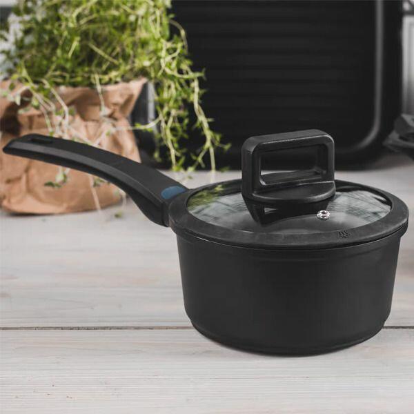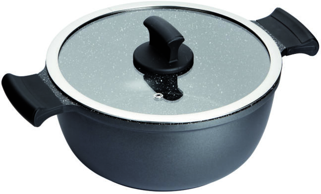 Inoxibar , bemutatjuk: Tapadásmentes, 6mm vastag, 4 réteggel ellátott lábas/edény. Fedővel csomagolva. Rétegek az aljától sorolva: rozsdamentes alj, öntött alumínium réteg, középső réteg és tapadásmentes bevonat. A termék átmérője 20 cm, magassága 9,5cm. Absolute Black Range, fekete fogantyúval. A tapadásmentes felületet a GREBLON német technológia biztosítja, amely g