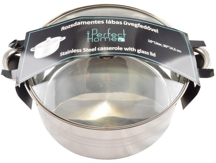 A csomag tartalma:1 db Perfect Home 13234 Rozsdamentes lábas 30 cm + fedő Használható indukciós főzőlapon. Anyaga: rozsdamentes acél, üveg Mérete: 31,5 cm átmérőjű; 41 cm széles füllel együtt, 14,9 cm magas, 20 cm magas fedővel együtt Űrtartalma: 9 l Súlya: 2,234 kg Használható: gáz-, kerámialapos -, elektromos-, indukciós tűzhelyen egyaránt. Használati utasítás: az