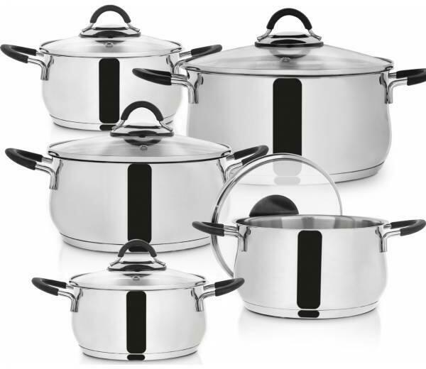Fazékkészlet - öt fazék fedéllel. Az üveg fedéllel ellátott serpenyők nagyszerűek minden modern háztartásban, és ideális módja az egészséges étrendnek, étrendnek, gazdaságosságnak és az ételek esztétikai elkészítésének. A felgyülemlett energia továbbítja a hőt az edénybe - a hőforrást előre kikapcsoljuk. Anyaga: kiváló minőségű rozsdamentes acél 18/10, üv
