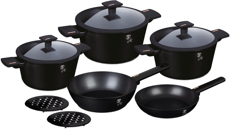 Gyártó: Berlinger Haus Modell: Monaco 10 pcs (BH/7081) Leírás: A BerlingerHaus tapadásmentes edényei 3 rétegű és tartós márvány bevonatukkal megakadályozzák, hogy sütés-főzés közben az étel hozzáragadjon az edények falához. Minimális zsiradékkal használhatók, így segítenek az egészséges táplálkozásban. Bevonatuk nem tartalmaz káros anyagokat, PFOA, ólom és kadm