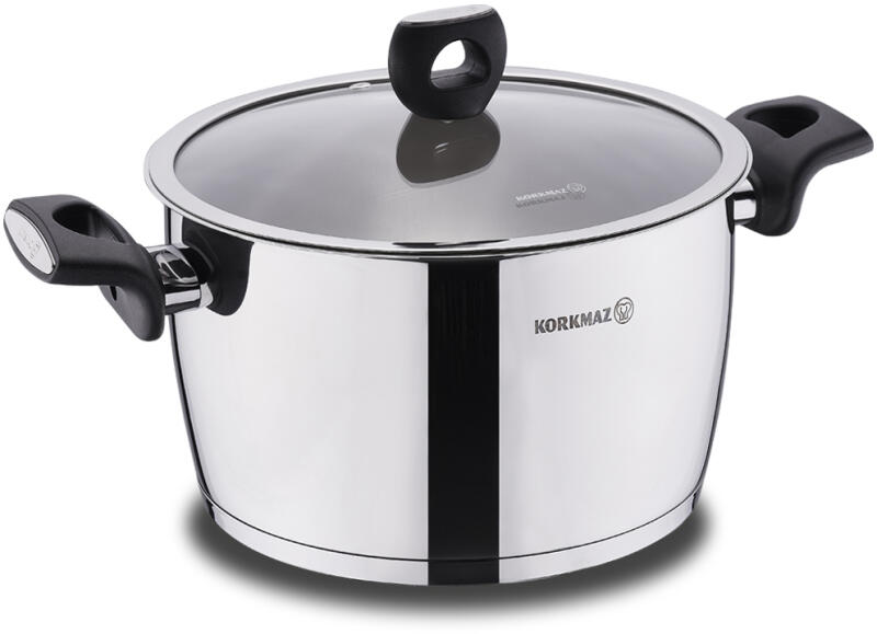 Rozsdamentes acél lábas fedővel Korkmaz Nora 18/10 Cr-Ni rozsdamentes acélból készült Nora edények hőálló műanyag fogantyúkkal, és hőálló üveg fedővel készülnek. A Solar Base rendszer a legmagasabb hőátadást biztosítja minden típusú főzőlapon, ezáltalmaximális idő- és energiamegtakarítást biztosít. Használható indukciós, gáz, elektromos, kerámia főzőlapok