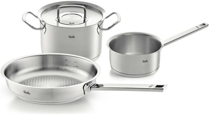 Főzőedények Fissler ORIGINAL-PROFI COLLECTION - profiktól profiknak. Robusztus rozsdamentes acél anyag és nehéz, szorosan záródó fedél, ez az a fajta főzőedény, amelyet minden professzionális konyhában megtalál. A sorozat edénykészlete egy 4,0 literes, fedeles lábasból, egy 24 cm átmérőjű serpenyőből és egy 1,4 literes, fedő nélküli lábasból áll. A serpenyő Novog