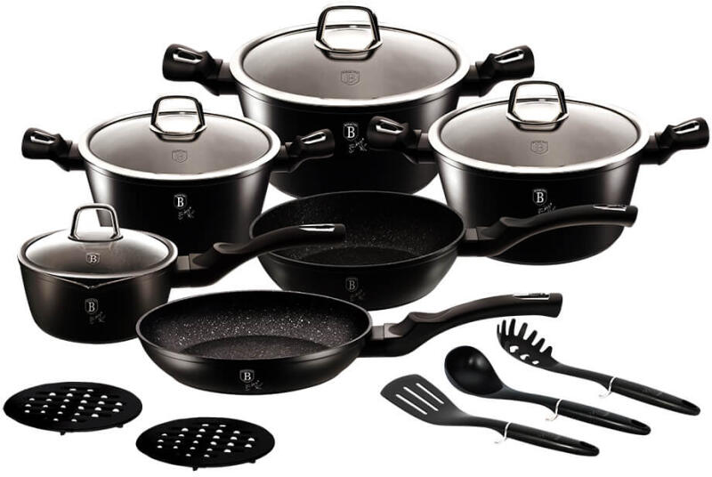 Berlinger Haus 15 részes edénykészlet Black Silver - BH-6155 A BerlingerHaus tapadásmentes edényei 3 rétegű és tartós márvány bevonatukkal megakadályozzák, hogy sütés-főzés közben az étel hozzáragadjon az edények falához. Minimális zsiradékkal használhatók, így segítenek az egészséges táplálkozásban. Bevonatuk nem tartalmaz káros anyagokat, PFOA, ólom és kadmium