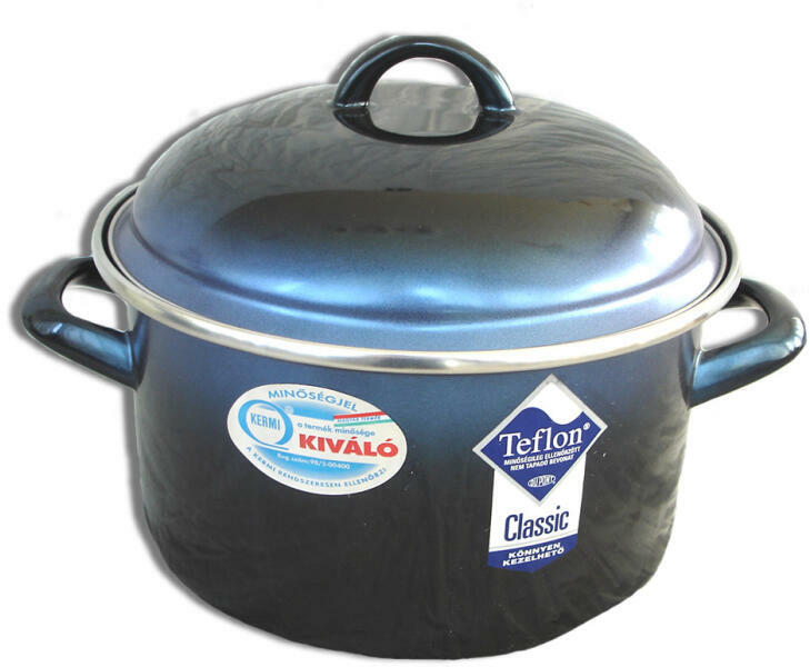 Bonyhádi Elit zománcozott teflonos fazék + fedő 20 cm(514020025) . A Bonyhádi kék árnyalt, zománcozott fazék az Elit termékcsalád tagja. A fazék űrtartalma 3,25 liter, átmérője 200 mm, magassága 124 mm. A fazékbelső teflonos felületű, az edény külső részén pedig fekete - kék árnyalt dekoráció található. A magas fedő is zománcozott fémből, fémfüllel készült.