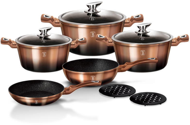 Gyártó: Berlinger Haus Modell: Rose Gold Collection 12 pcs (BH/1591) Leírás: A BerlingerHaus tapadásmentes edényei 3 rétegű és tartós márvány bevonatukkal megakadályozzák, hogy sütés-főzés közben az étel hozzáragadjon az edények falához. Minimális zsiradékkal használhatók, így segítenek az egészséges táplálkozásban. Bevonatuk nem tartalmaz káros anyagokat, PFOA,