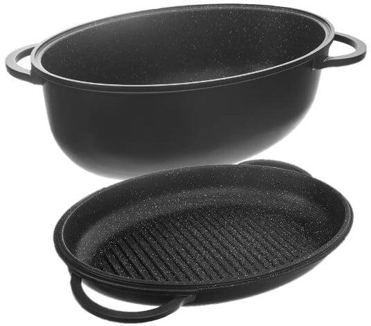 A GRANDE sütőedény használható klasszikus, fedeles sütőedényként a húsok elkészítéséhez, vagy mindegyik része külön-külön is - mély sütőedényként vagy profilozott aljú, sekély sütőedényként sütéshez és olajban sütéshez. A sütőedények kiváló minőségű, 2 rétegű PFLUON GRANIT tapadásmentes felülettel rendelkeznek, amely lehetővé teszi az étele