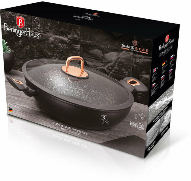 Gyártó: Berlinger Haus Modell: Black Rose Collection Wok 30 cm (BH/7112) Leírás: A Black Rose Collection egy elegáns és stílusos sorozat, melynek tagja a kovácsolt alumíniumból készült Wok fedővel (30 cm). Mérete és turbó indukciós talpa miatt tökéletes választás bármilyen szabványos tűzhelyhez. A 3 rétegű márvány bevonatnak köszönhetően az ételek nem ragadnak oda,