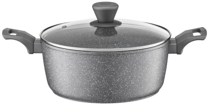Ambition Silverstone lábas üvegfedővel, tapadásmentes bevonattal, 24 cm Az Ambition Silverstone lábas 24 cm-es kovácsolt alumínium termék. Anyagának köszönhetően a lábas gyorsabban felmelegszik, kiváló a hőtartása, ezáltal energiatakarékos. A termék belső felülete Qualum Basic Stone Edition bevonat, mely egyedi kőhatású, kiváló tapadásgátló tulajdonságú és magas ko