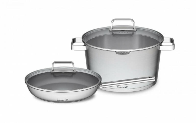 Gourmet Miracle edénykészlet, egy serpenyővel több, 11 darabos, rozsdamentes acél/greblon G21 Gourmet Miracle edénykészlet különleges 18/10 CrNis élelmiszeripari rozsdamentes acélból készült GREBLON® C3+ belső tapadásmentes felülettel magas ellenállással. Minden edény és serpenyő erős szendvics aljjal rendelkezik a tökéletes egyenletes hőelosztásért és megfelelnek min