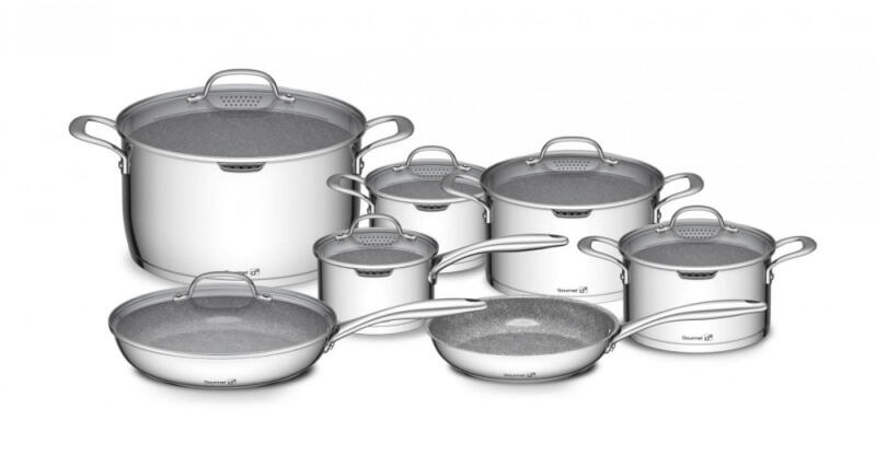 Gourmet Miracle edénykészlet szűrővel, 13 darab, rozsdamentes acél/greblon G21 Gourmet Miracle edénykészlet különleges 18/10 CrNis élelmiszeripari rozsdamentes acélból készült GREBLON® C3+ belső tapadásmentes felülettel magas ellenállással. Minden edény és serpenyő erős szendvics aljjal rendelkezik a tökéletes egyenletes hőelosztásért és megfelelnek minden típusú t