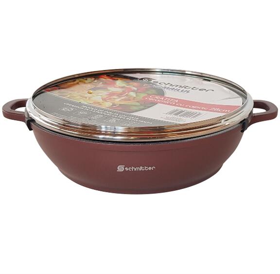 Cratita Schmitter, aluminiu turnat, 28 cm, 3.5L Az edény alja 3 rétegből áll ami segíti a hő egyenletes eloszlását. 2 rétegű kerámia bevonatú belső Alsó vastagság 4,2 mm Metalizált szín Hőálló üvegfedél Használható a sütőben (fedél nélkül).