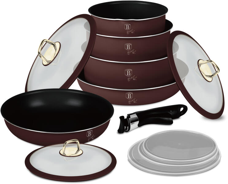 A Leonardo Collection 12 részes edénykészlet egy elegáns és praktikus választás a modern konyhák számára. Az alumíniumból készült edények tartósak és egyenletes hőeloszlást biztosítanak, így ideálisak a mindennapi főzéshez. A matt bordó színű edények stílusos megjelenést kölcsönöznek a konyhának, és a BerlingerHaus többi termékével harmonikusan összehangolhat