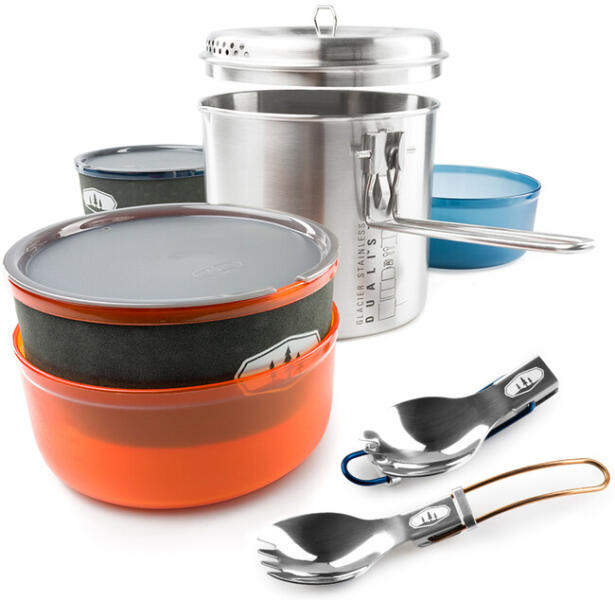A Glacier Dualist egy 2 személyes főzőedénykészlet 1,8 literes főzőedénnyel, amely kiváló minőségű Glacier rozsdamentes acélból készült. A készlet tartalmaz 2 tálat, 2 csészét perforált fedéllel az iváshoz, 2 összecsukható kanalat, egy perforált fedelet a víz leszűréséhez és egy fedelet az