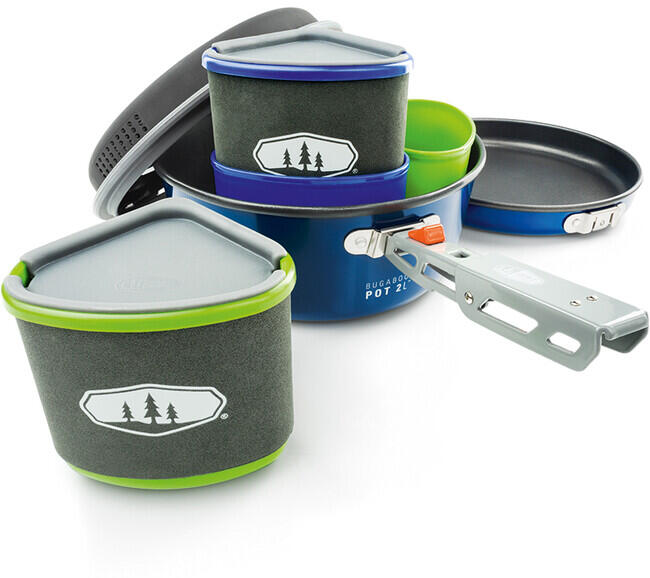 Egy nagyobb, 2 darabos Bugaboo főzőedénykészlet túrázáshoz és csónakázáshoz. Ebbe a készletbe gázfőző is belefér. A BPA-mentes műanyagból készült perforált fedél lehetővé teszi, hogy a gőz zökkenőmentesen távozzon az edényből, és szűrőként is szolgál, például a tésztából kifolyt vízhez. Az