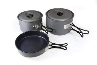 Extrémen könnyű Origin Outdoors főzőedénykészlet kemény eloxált alumíniumból. Ideális több személyre való főzéshez, például kempingezés közben. Elhelyezkedik stabil összecsukható fogantyúkkal, amelyek bármilyen dőlésszinten biztos tartást nyújtanak. Az edényeket folyadékszint jelöléssel és