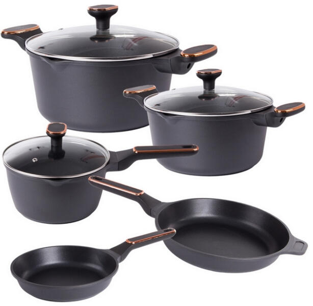 Nyolc présöntött alumínium edényből és serpenyőből álló készlet tapadásmentes bevonattal. Az edényeket nagy ellenállás, egyenletes hőeloszlás és könnyű tisztíthatóság jellemzi. Az edények ergonomikus fogantyúi kényelmes és biztonságos tartást biztosítanak. Alkalmas minden halogén, kerámia, gáz és indukciós tűzhelyhez. Fekete színű.