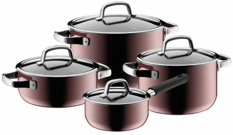 A FUSIONTEC WMF edénykészlet, 4 darabos a kövektezőket tartalma: Lábas Ø 20 cm, térfogat 2,4 l, üvegfedővel, termékkód: WM0514575290 Fazék Ø 20 cm, térfogat 3,7 l, üvegfedővel, termékkód. : 0514375290 Fazék Ø 24 cm, térfogat 6,4 l, üvegfedővel, termékkód. : 0514475290 Nyeles lábas Ø 16 cm, térfogat 1,3 l, üvegfedővel, termékkód: WM0515275290