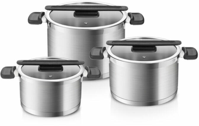 Modern konyhai edények egyedi rozsdamentes acél üvegfedővel, kényelmes, ellenálló műanyagból készült füllel, háromrétegű szendvicsaljjal és mérőskálával. A fedők biztonságosan tárolhatóak az edény peremén, a kondenzált gőz visszafolyik az edénybe. Kiválóan tárolhatóak, az edények egymásba helyezhetőek, az edények belsejébe helyezhető fedők helytakarékosak a