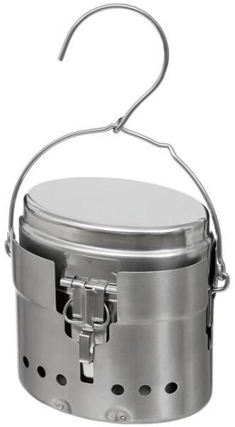 SE Mess Kit, M40, rozsdamentes acél, 3 részből álló, egymásba rakható részek1 nagy edény, kb. 19 x 12,5 x 13,5 cm (hosszúság x szélesség x magasság)kb. 1,5 lfogantyúval és kampóval, 2 felfüggesztési pozícióval1 serpenyő, kb. 16 x 11,5 x 6 cm (H x B x K)kb. 600 mlfedőként
