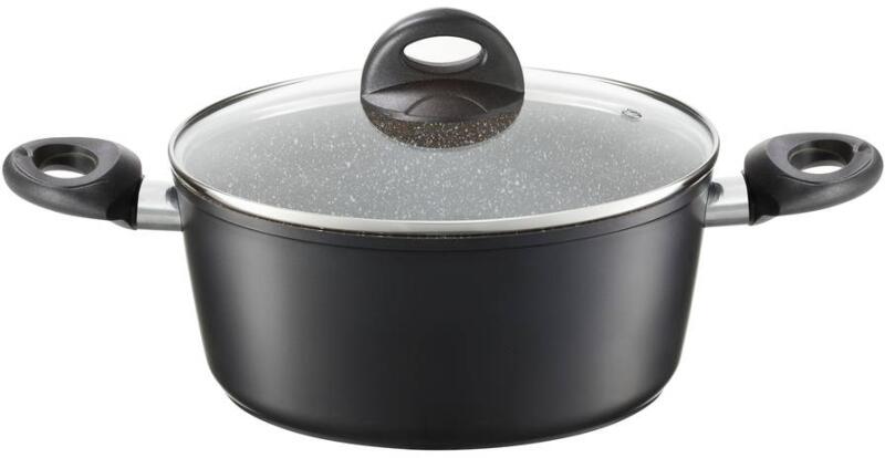 Kiváló választás azok számára, akik értékelik a kényelmet és a funkcionalitást a konyhában. Kovácsolt alumíniumból készült, amely nagyon tartós és ellenáll a sérüléseknek. Belseje kőhatású Qualum Basic Stone Edition tapadásmentes bevonattal rendelkezik, kívül pedig gyönyörű, elegáns fekete. A fogantyú kiváló minőségű anyagból készült. A vastag falak és a