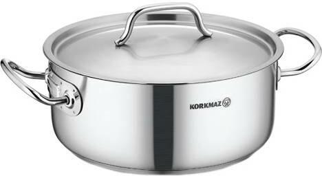 Rozsdamentes acélból készült alacsony lábas Korkmaz. Méretek 24 x 10 cm, térfogat 4,5 l.