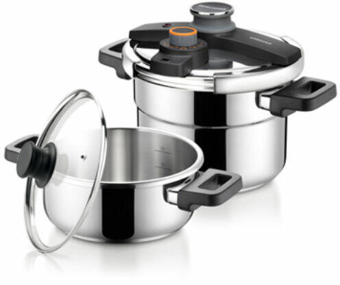 Az ULTIMA luxus minőségű kukta készlet két 4.0 l és 6.0 l edényt tartalmaz, az egyszerű IDEALCOOK tökéletes nyomásbeállítóval kiválóan alkalmas hagyományos ételek egyszerű és gazdaságos elkészítéséhez. A nagy, elfordítható fedőzárónak köszönhetően az edény kényelmesen nyitható és zárható egy kézzel is. Az ULTIMA DUO készlet tökéletesen tárolható, a 6.0