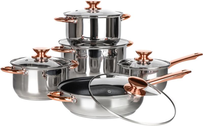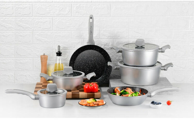 Royalty Line 10 darabos edénykészlet, tapadásmentes márvány bevonattal, RL-T010, fekete A Royalty Line ezt a 10 darabos edénykészletet a jó ízek megőrzése és az egészséges főzés érdekében alkotta meg. A serpenyők és sütőedények kiváló minőségű márvány felülettel rendelkeznek, és mindenféle főzőfelületre alkalmasak, beleértve az indukciós főzőlapokat is. Ez e