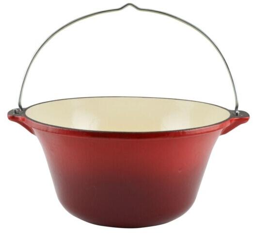 Perfect Home Zománc Öntöttvas Bogrács, 10.8l, piros Anyaga: öntött vas, kívül-belül zománcozottMéretei: 37 cm felső átmérőjű, 16 cm magasŰrtartalma: 10,8 literSúlya: 7,15 kgSzíne: kívül piros, belül vajszínűHasználható: szabad tűzönTisztítása: semleges folyékony mosogatószerrel mossa el. Alaposan törölje szárazra! Kerülje a karcosodást okozó szerek és eszköz