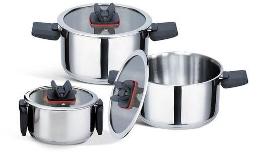 Features: Product colour: Stainless steel Material: Stainless steel Steamer pan: No Frying pan(s): No Suitable for hob types: Electric, Induction, Ceramic, Halogen, Sealed plate, Gas Lid material: Glass Lid included: Yes Handle material: Plastic Saucepan(s): No Foldable handle: Yes Handle colour: Black Weight & dimensions: Pot diameter 3: 20 cm, 24 cm Stock pot diameter: 16 cm Pot capacity: 1,