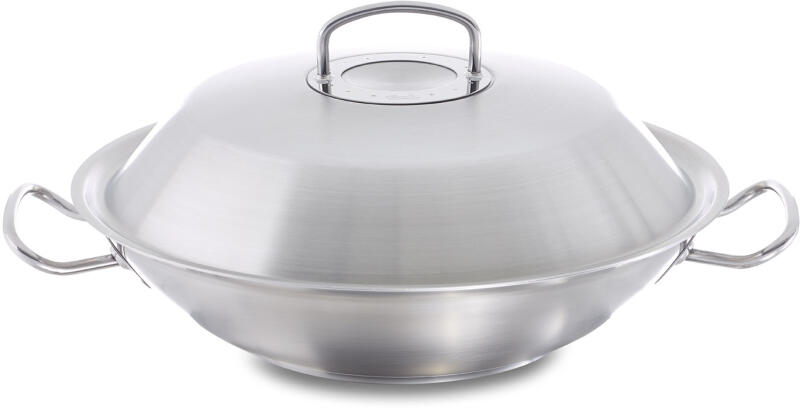 Fissler Wok fémből. fedél 5,6l 35cm Profi Acél wok nagy, kényelmes fogantyúval. Ezenkívül acélrácsral van felszerelve, amely lehetővé teszi a zsírok elvezetését az edényekből. Az Original Profi kollekciót német szakemberek tervezték. Ezek az edények megfelelnek a legmagasabb minőségi és tartóssági követelményeknek. Tökéletesek, tartósak és mindenekelőtt funkcionál