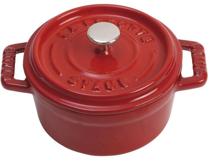 Staub Mini-Cocotte fazék, átmérője 10 cm, űrtartalma 0,25 l, öntöttvasból. A Staub termékek nagyon jó minőségű öntöttvasból készülnek, karcolásokkal és csorbulással szemben ellenállóak, könnyen tisztíthatóak és hosszú élettartam jellemzi őket. Az edény anyagjának köszönhetően, magukban tartják a hőt, melegen tartják az ételt akkor is, miután kivettük a süt