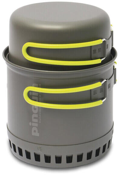 Két edény két mély fedővel, amelyek közül a nagyobbik hőcserélővel van ellátva, alumíniumból készült, eloxált felülettel. Az összecsukható fogantyúk acélhuzalból készültek, szilikon hőálló csővel ellátva. Az eloxálás (más néven Eloxálás) egy nagyon erős és kemény alumínium-oxid réteget hoz