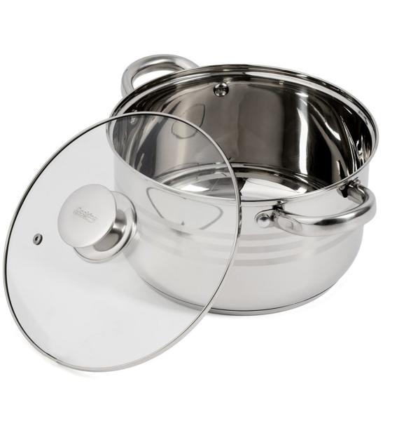 Perfect Home 92048 Lábas + üvegfedő 8 liter. A rozsdamentes edények nagyon jól állják a „sarat a konyhában, igen tartósak, nem véletlen hogy a nagykonyhákban, éttermekben, szállodákban csak ezeket használják. Jól ellenállnak a tisztításnak, és a tisztítószereknek. Használat közben káros anyagok nem oldódnak ki belőlük. Ráadásul „csillogó felületük igen esztét