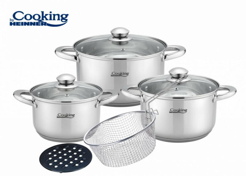 Cooking by Heinner Victoria főzőedénykészlet, 8 darab, rozsdamentes acélból készült 1 x kis serpenyő 18 x 10,5cm + fedél 2,6L, 1 x fél fazék 22 x 12,5cm + fedél 4,7L, 1 x fél fazék 24 x 13,5cm + fedél 6,1L, 1 x forró edénytartó állvány D: 16.5cm1 x sütőkosár + fogantyú D: 20x8,5 cm Első használat előtt és minden használat után meleg vízzel és folyékony mosószerre