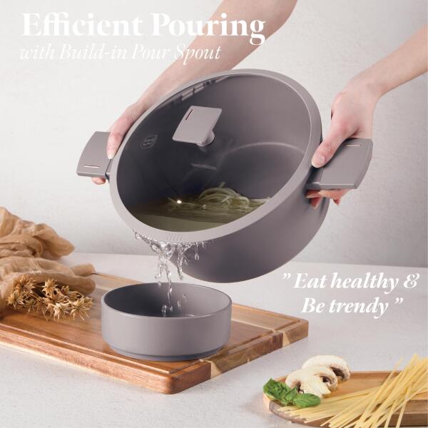 A Taupe Collection Lábas fedővel (8 L) egy elegáns és praktikus választás a modern konyhák számára. A kovácsolt alumíniumból készült lábas O30*13,5 cm méretű, 8 liter űrtartalommal rendelkezik, így ideális méret a nagyobb adagok elkészítéséhez. A matt taupe színű tapadásmentes titánPro bevonat pedig garantálja, hogy az ételek nem tapadnak le az edény falához, így