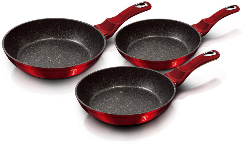 Gyártó: Berlinger Haus Modell: Burgundy Metallic Line 3 pcs (BH/1288N) Tulajdonságok: 3 rétegű új kő hatású márvány bevonat Ergonomikus puha tapintású nyél Turbó indukciós talp Mosogatógépben mosható-könnyen tisztítható! 35% energiát takarít meg Környezetbarát technológia PFOA, LEAD, cadmium mentes Anyaga: kovácsolt alumínium A készlet tartalma: 1 db serpenyő: átmé