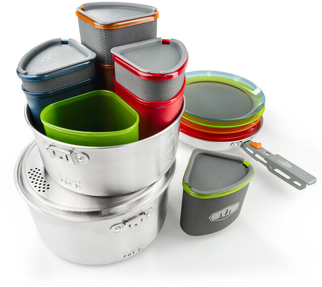 2 db minőségi, rozsdamentes acélból készült lábas és egyéb kempingfelszerelés 4 fő részére. A perforált rozsdamentes acélfedél lehetővé teszi, hogy a gőz zökkenőmentesen távozzon a lábasból, és szitaként is szolgál, például a tésztából a víz leöntéséhez. Egy praktikus összecsukható fogantyú